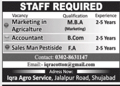 Jobs in Iqra Agro Services Shujabad Staff Required
