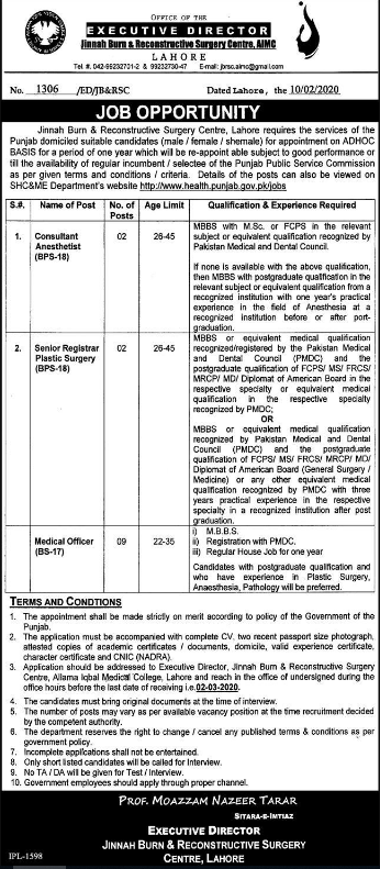Jobs in Jinnah Burn and Reconstructive Surgery Center, Lahore Positions Vacant