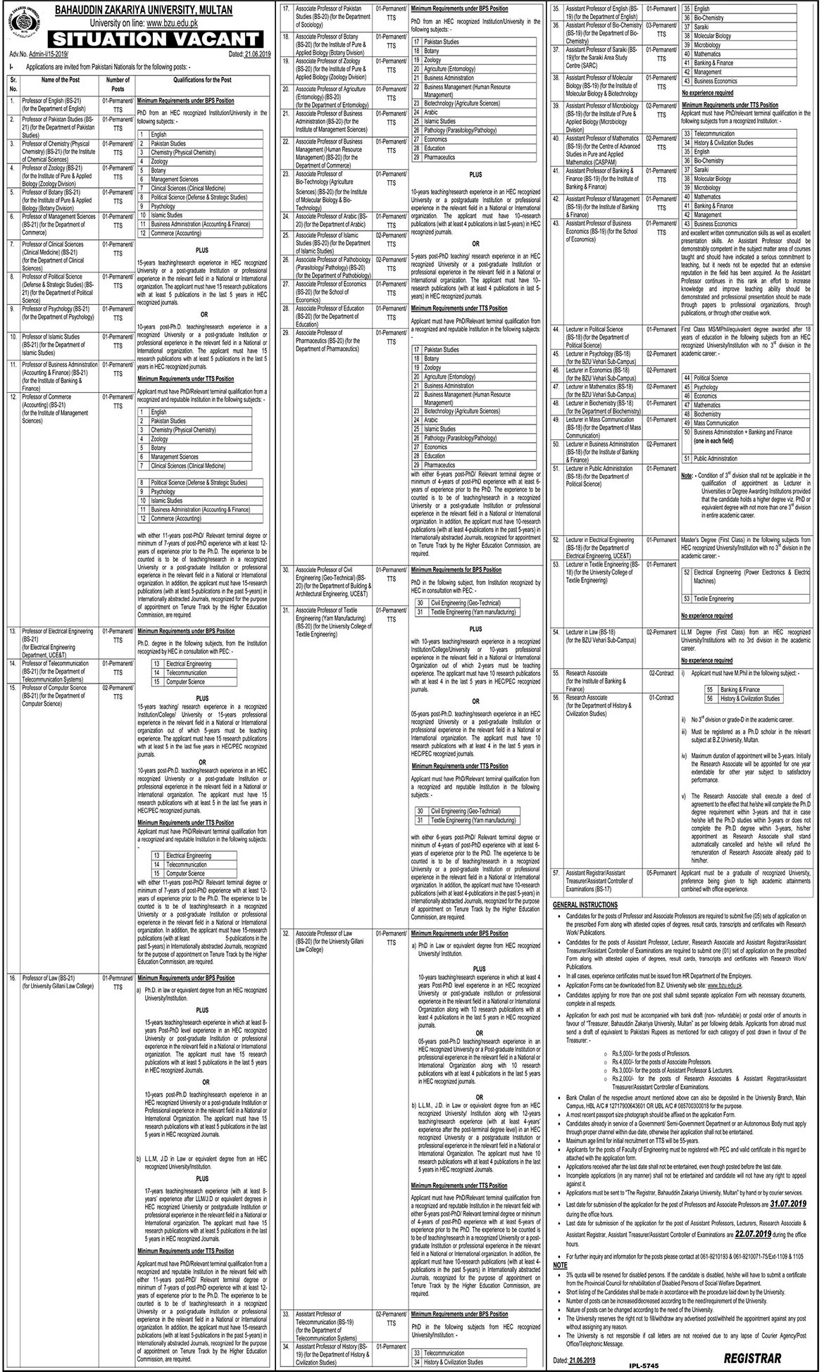 Jobs in Bahauddin Zakariya University 29 June 2019