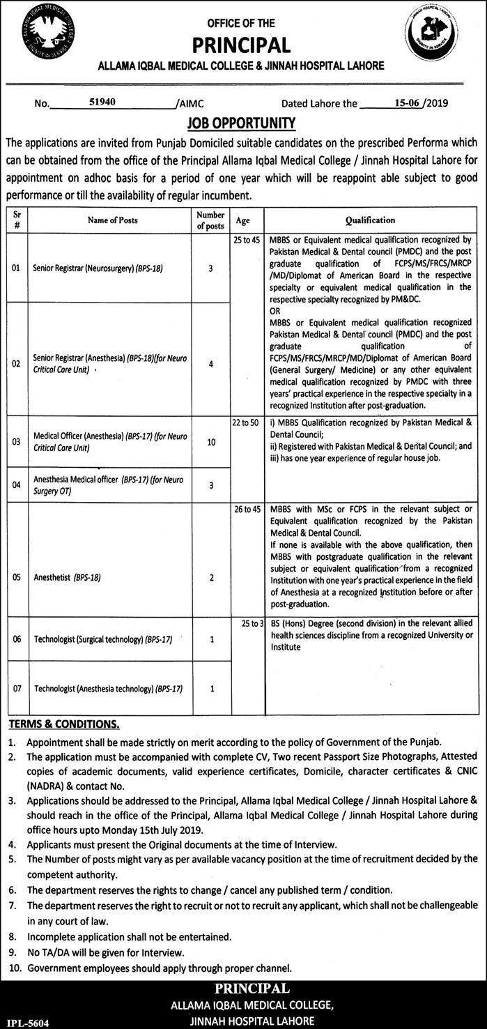Jobs in Allama Iqbal Medical College 22 June 2019