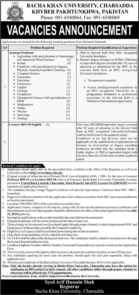 Jobs in Bacha Khan University Charsadda 29 June 2019