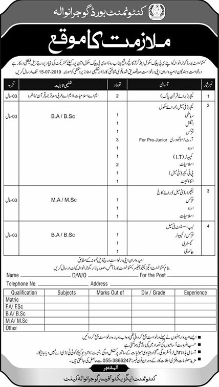 Jobs in Cantonment Board Gujranwala 27 June 2019