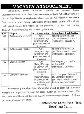 Jobs in Cantt Public High School & Girls College Nowshera 03 July 2019