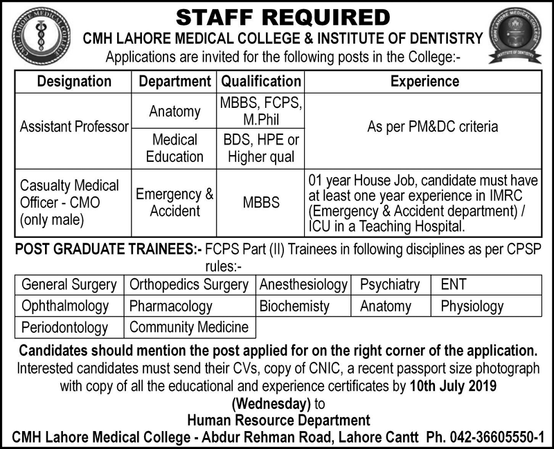 Jobs in CMH Lahore Medical College & Institute of Dentistry 04 July 2019