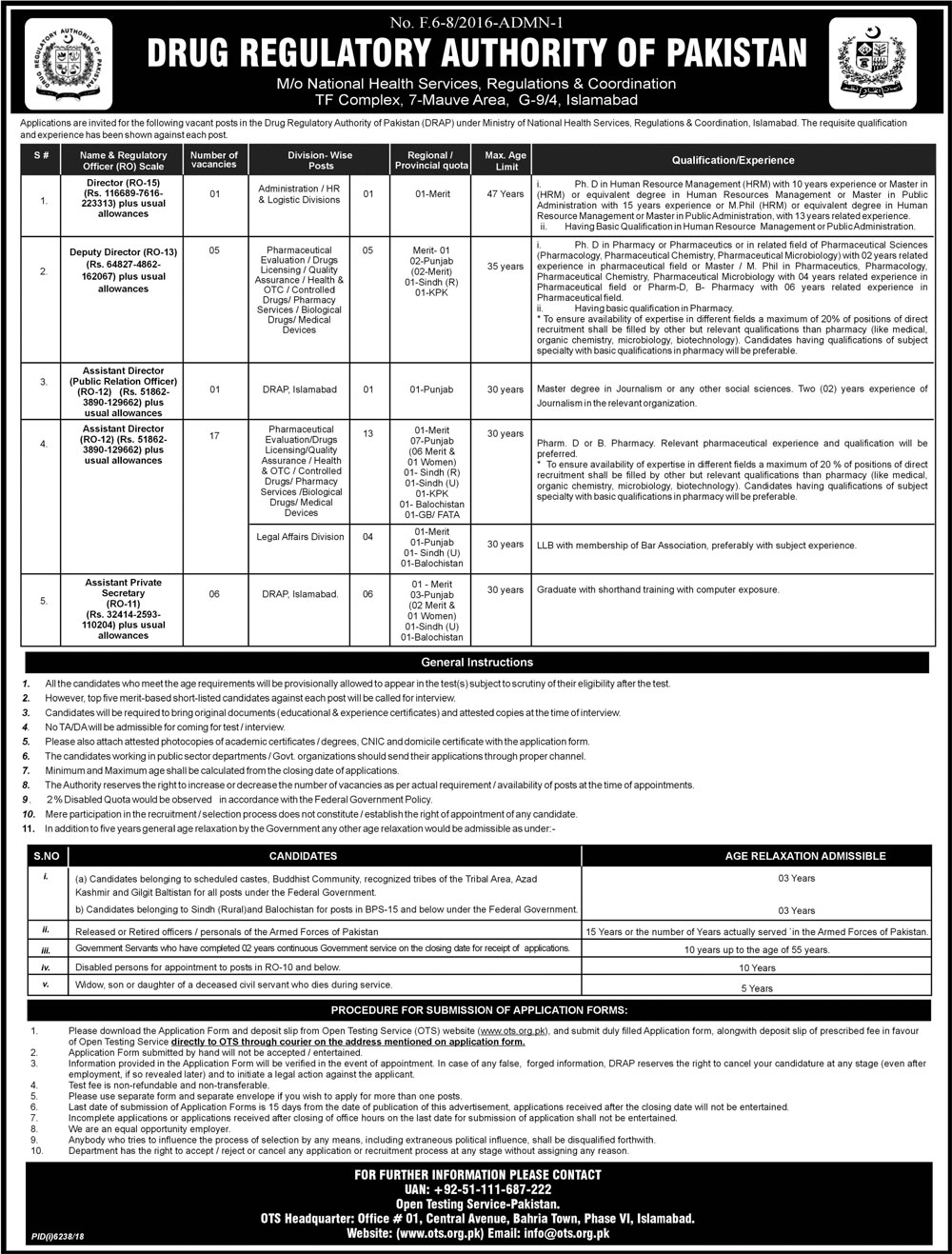 Jobs in Drug Regulatory Authority of Pakistan 30 June 2019