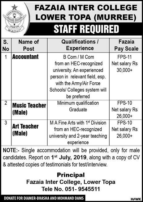 Jobs in Fazaia Inter College Lower Topa 28 June 2019