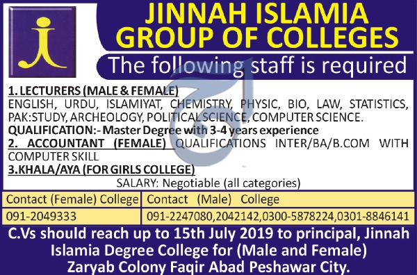 Jobs in Jinnah Islamia Group of Colleges 01 July 2019
