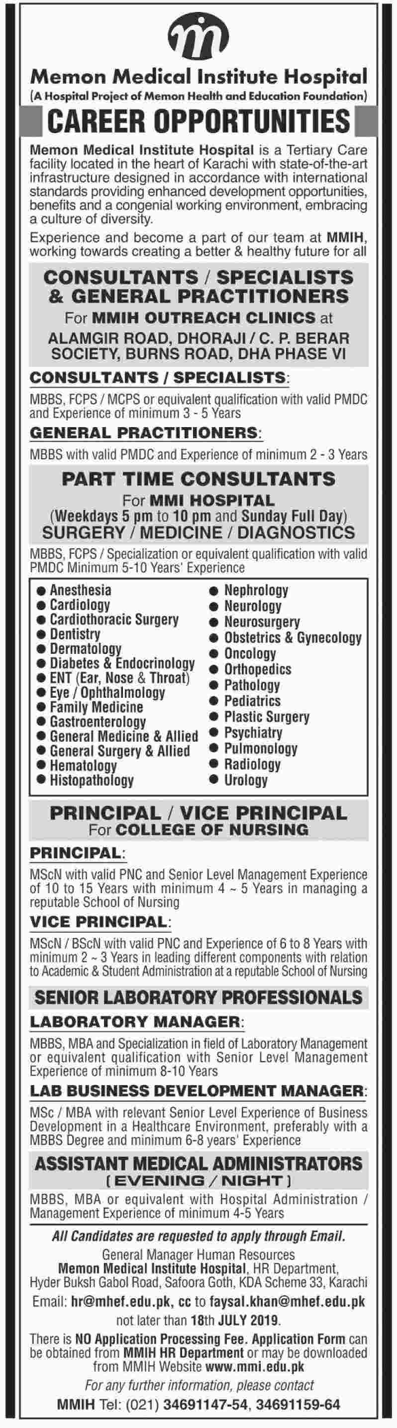 Jobs in Memon Medical Institute Hospital 07 July 2019