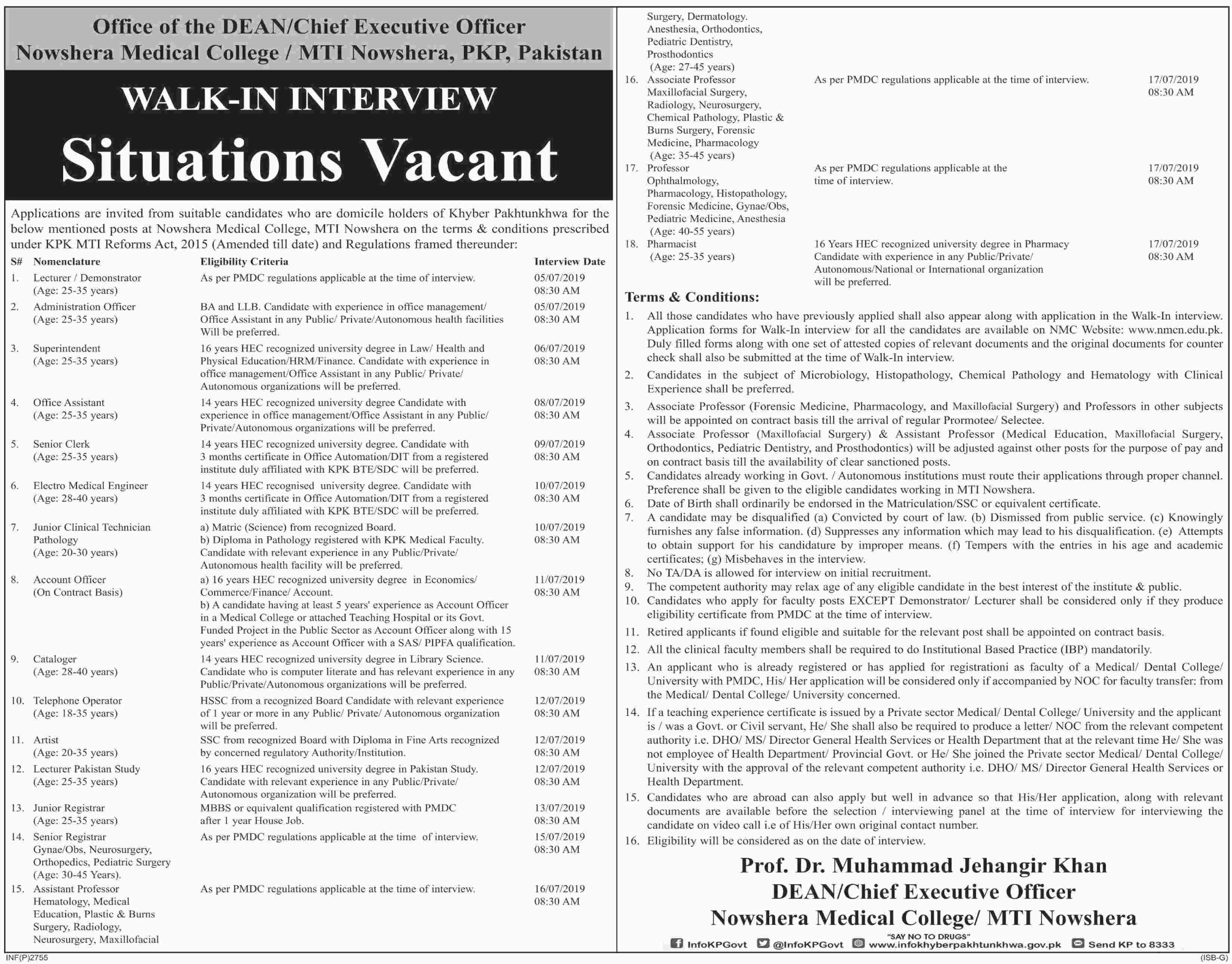 Jobs in Nowshera Medical College 22 June 2019
