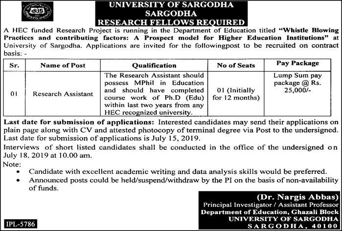 Jobs in University of Sargodha Research Assistant 28 June 2019