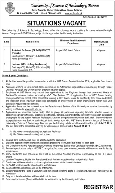 Jobs in University of Science and Technology Bannu 06 July 2019