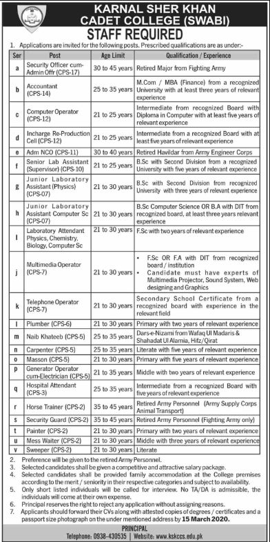 Jobs in Karnal Sher Khan Cadet College Swabi Staff Required