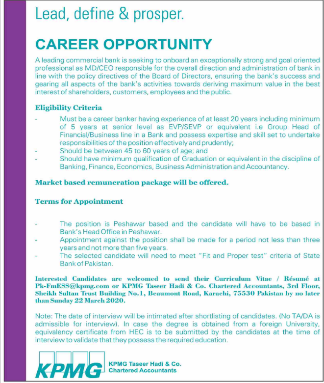 Jobs in KPMG TASEER Hadi and Co. Career Opportunity