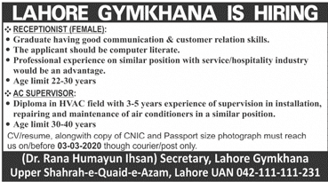 Jobs in Lahore Gymkhana Staff Required