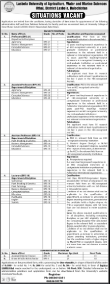 Jobs in Lasbela University of Agriculture, Water & Marine Sciences Situation Vacant