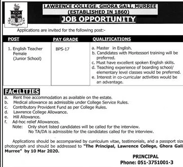 Job in Lawrence College Ghora Gali, Murree Female Teacher Required