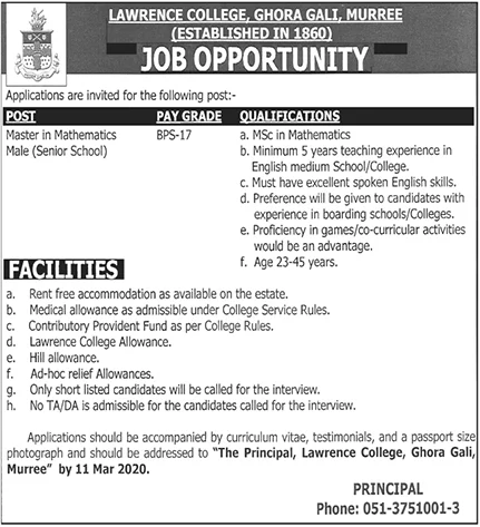 Jobs in Lawrence College Ghora Gali, Murree Positions Vacant