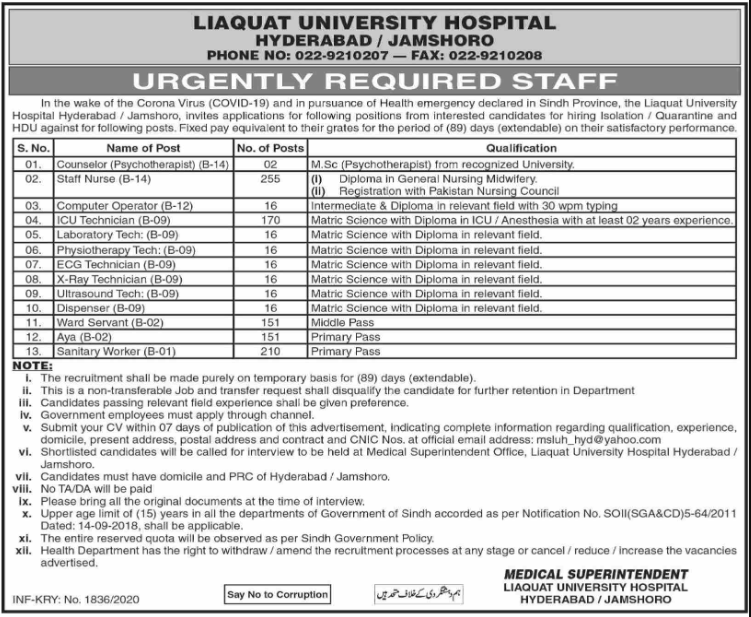 Jobs in Liquat University Hospital Hyderabad / Jamashoro Urgenty Staff Required