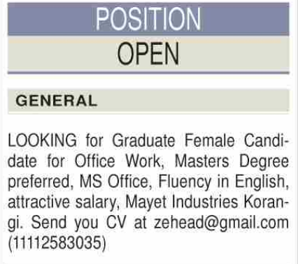 Job in Mayet Industries Pvt Ltd Position Vacant