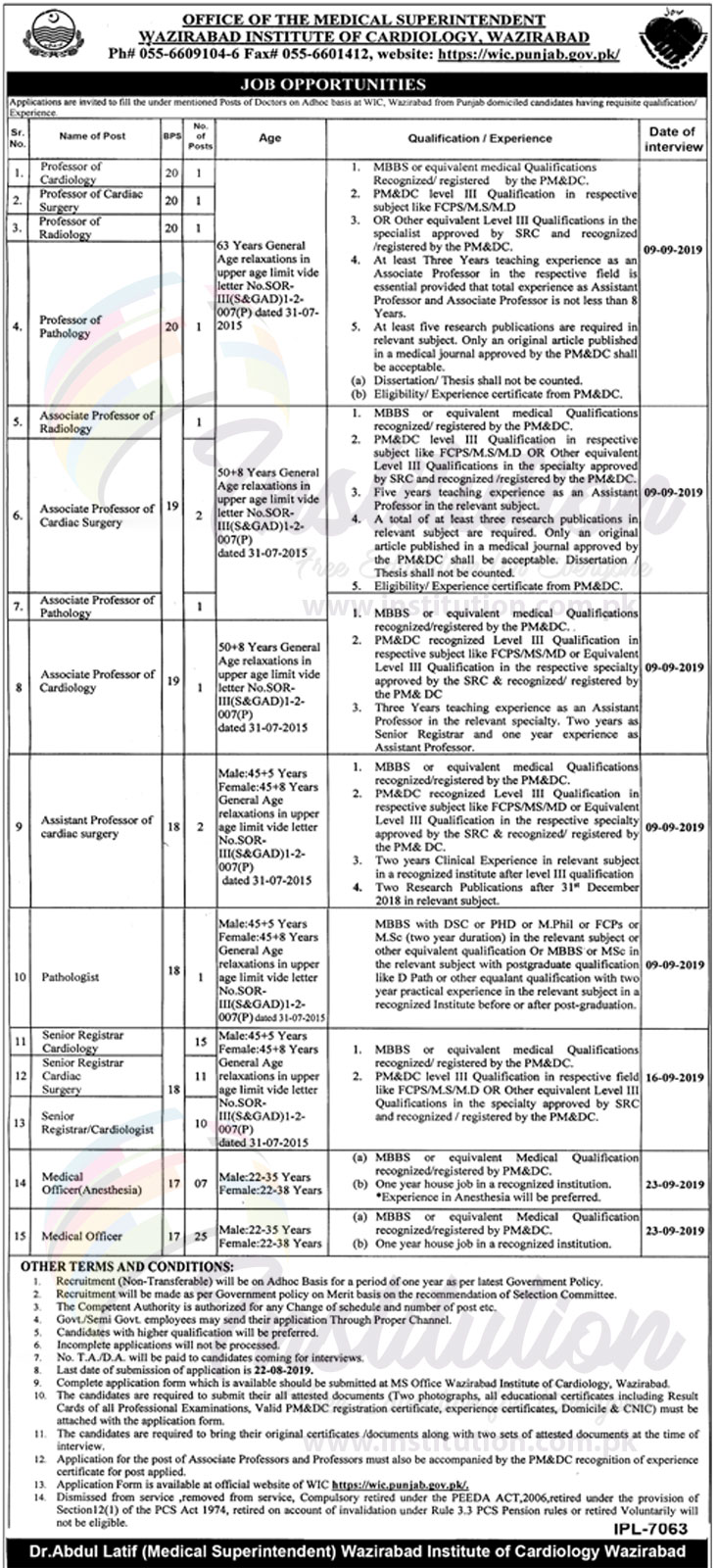 Multiple Jobs (Career) Opportunities in Office of The Medical Superintendent Wazirabad Institute of Cardiology, Wazirabad