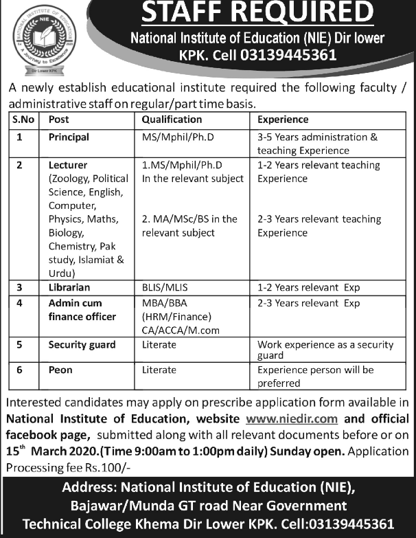 Jobs in National Institute of Education Lower Dir Staff Required