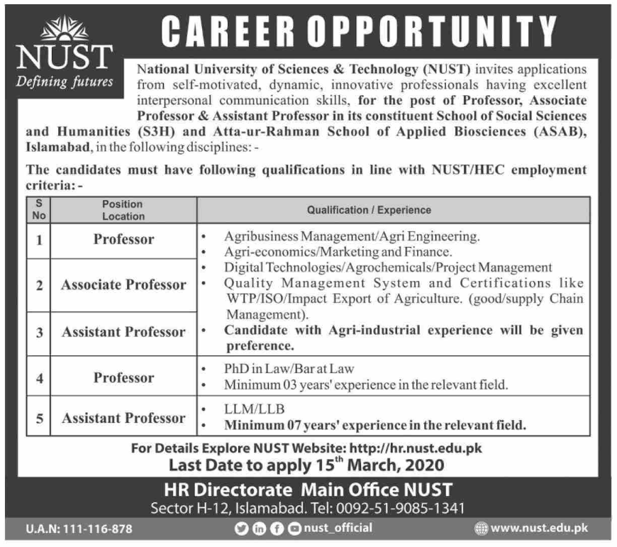 Jobs in National University of Sciences and Technology Positions Vacant