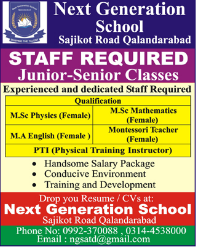 Jobs in Next Generation School Sialkot Staff Required