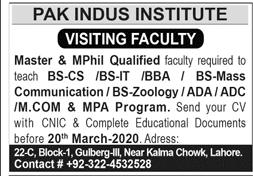 Jobs in Pak Indus Institute Visiting Faculty Required