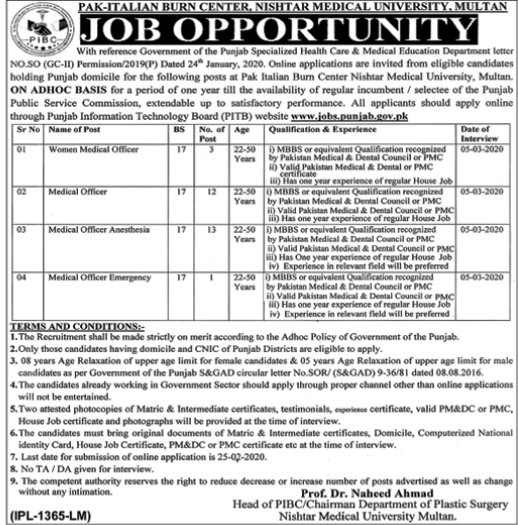 Jobs in PAK-ITALIAN Burn Center Nishtar Medical University, Multan Career Opportunity