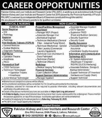 Jobs in Pakistan Kidney and Lever Institute and Research Center Career Opportunity