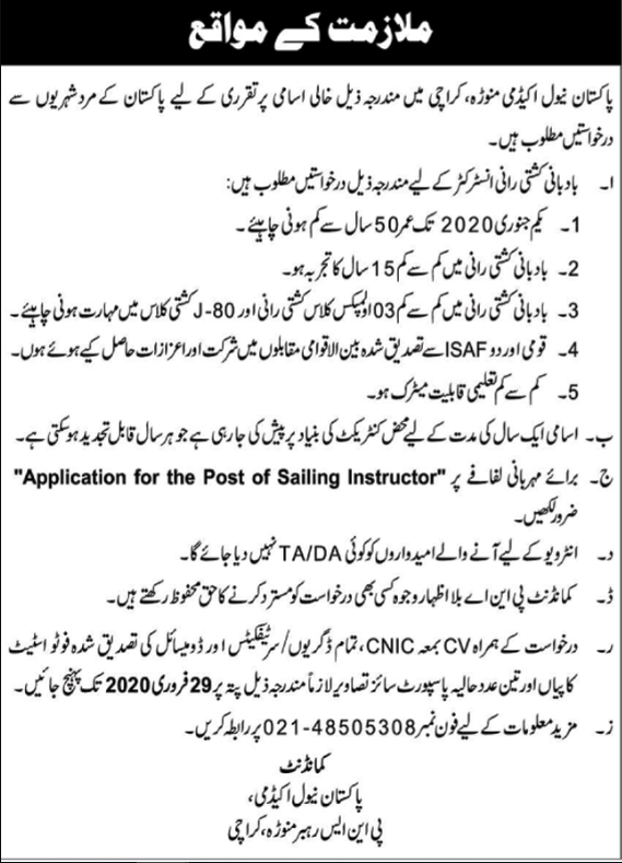 Jobs in Pakistan Navel Academy, Karachi Positions Vacant
