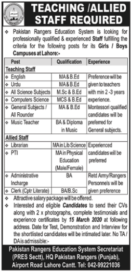 Jobs in Pakistan Rangers Education School System Teaching Staff Required