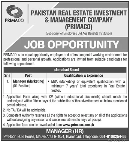 Job in Pakistan Real Estate Investment & Management Position Vacant