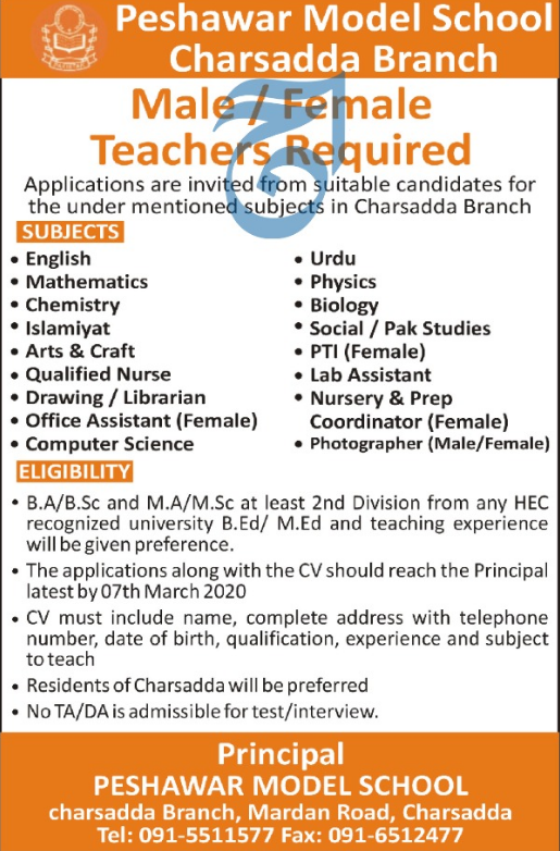 Jobs in Peshawar Model School Charsaddha Campus Male and Female Staff Required