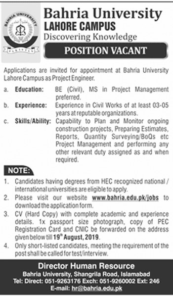 Position Vacant (Jobs Opportunity) in Bahria University Lahore Campus