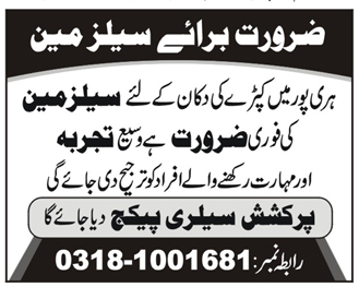 Jobs in Private Clothes Shop Haripur Salesmen Required