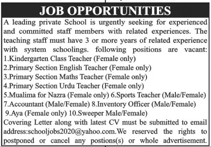 Jobs in Private School in Karachi Staff Required