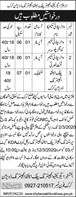 Jobs in Public Health Engineering Division Karak Positions Vacant