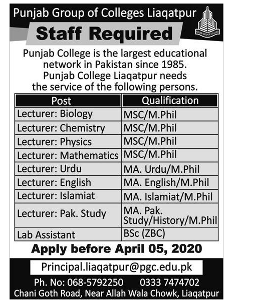 Jobs in Punjab Group of Colleges Staff Required