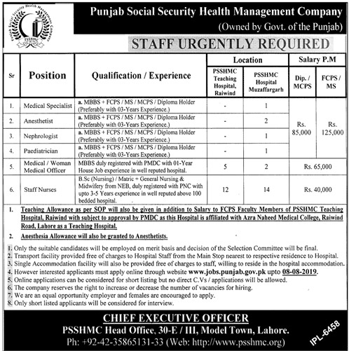Punjab Social Security Health Management Company Urgent Staff Required Medical Specialist, Anesthetist, Phrenologist, Pediatrician, Medical/ Woman Medical Officer, Staff Nurses Staff Required (Jobs Opportunity)