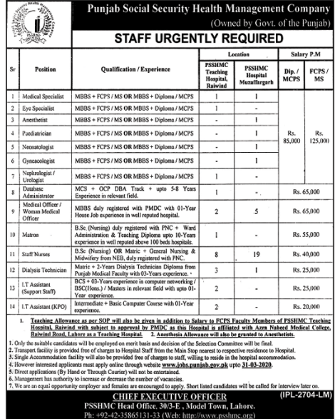 Jobs in Punjab Social Security Heath Management Company Lahore Urgently Staff Required
