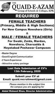 Jobs in Quaid-Azam Group of School and College Male and Female Staff Required