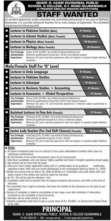 Jobs in Quaid-e-Azam Divisional Public School and College Staff Wanted