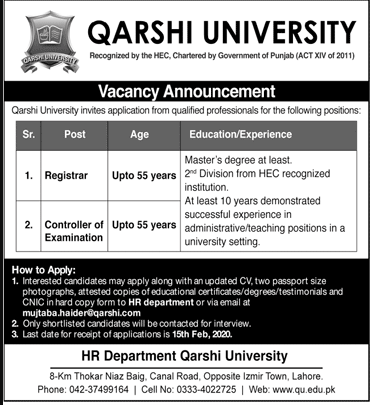Qurashi University Lahore Vacancy Announcement
