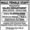 Jobs in Real Estate Marketing Company Multan Male and Female Sales Staff Required