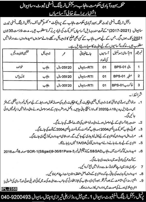 Jobs in Region Training Institute Sahiwal Positions Vacant