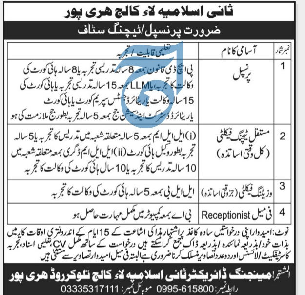 Jobs in Sani Islamia law College Haripur Positions Vacant