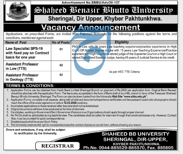 Jobs in Shaheed Benazir Bhutto University KPK Positions Vacant