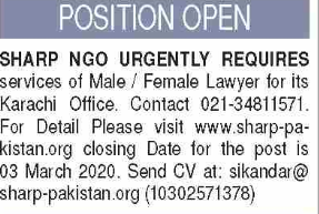 Jobs in SHARP Pakistan NGO for Lawyer Positions Vacant