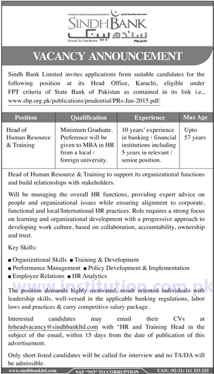 Sindh Bank Vacancies (jobs Opportunities) Head of Human Resource & Training